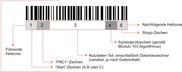 GS1-128 条形码的左右两侧有浅色区域。这些是设置条形码读取设备所必需的。